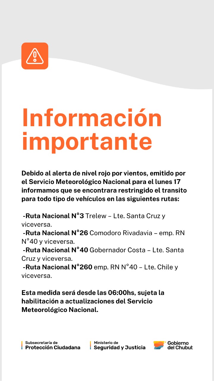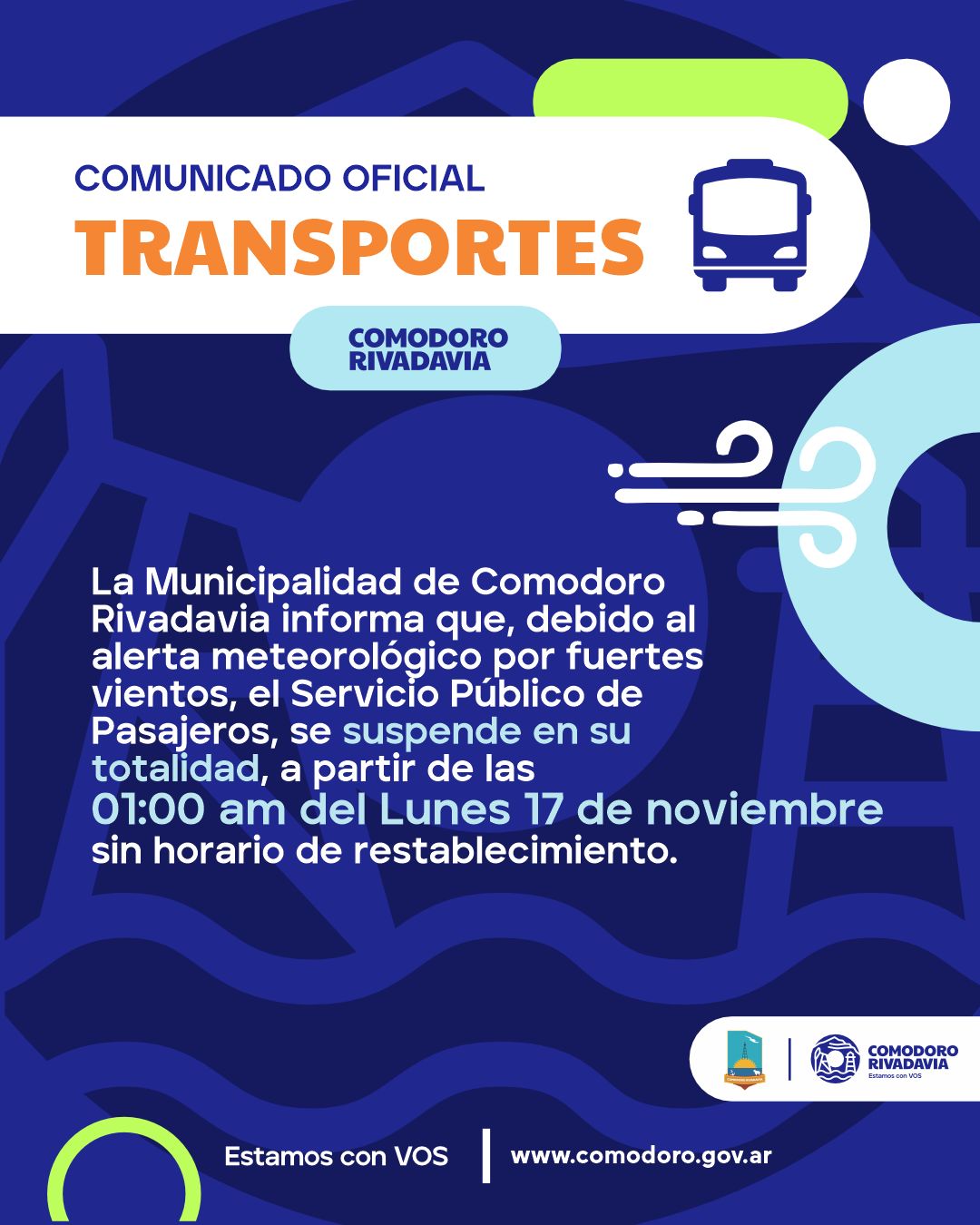 La Municipalidad de Comodoro Rivadavia informa que, debido al alerta meteorológico por fuertes vientos,